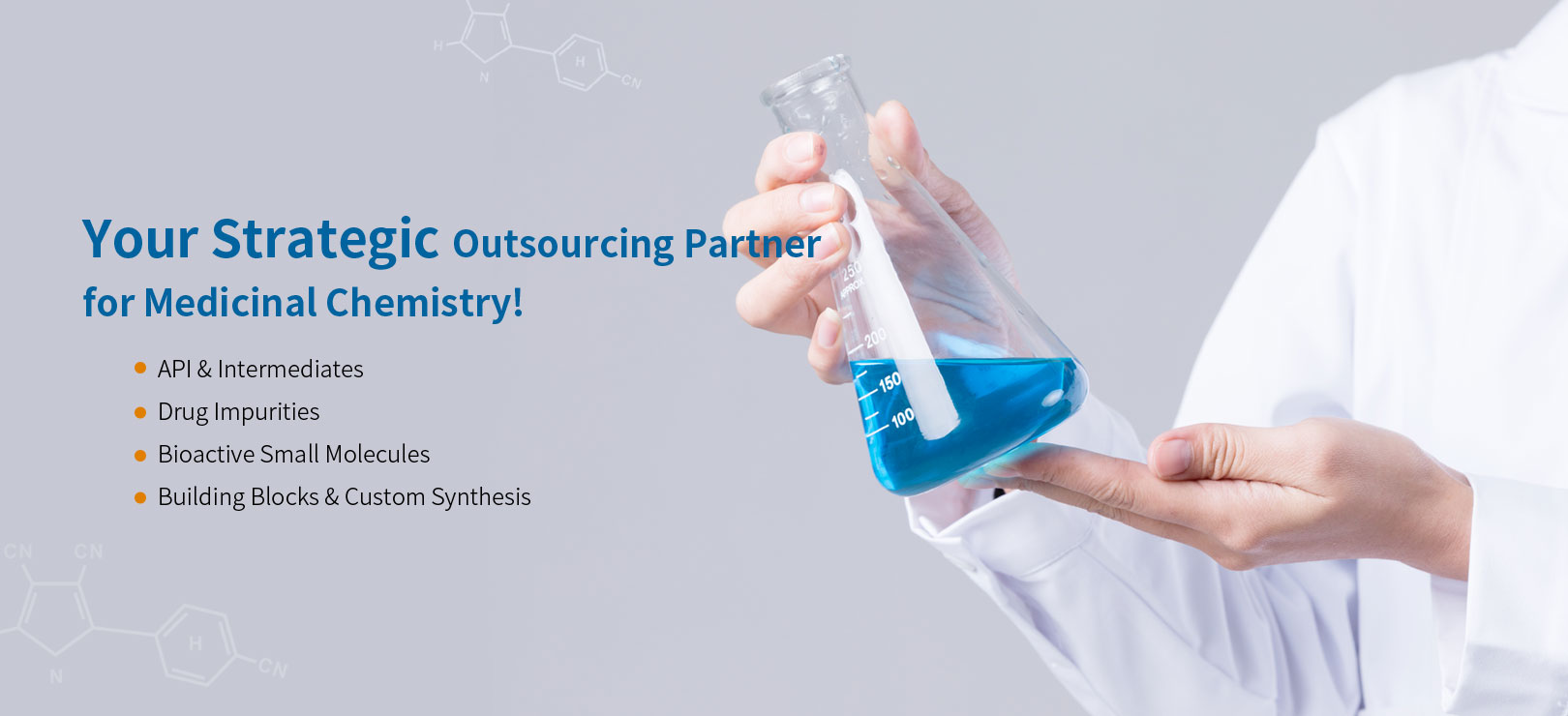 As a leading provider of chemical synthesis services, ChemLeader provides pharmaceutical intermediates, drug impurities, reference compounds, custom peptide Synthesis and other small molecule chemicals from milligram to kilogram level. We commit to provide high quality products and services in a timely manner. With professional trainings, close communication and strong problem-solving abilities, our team could ensure projects progress is going smoothly.